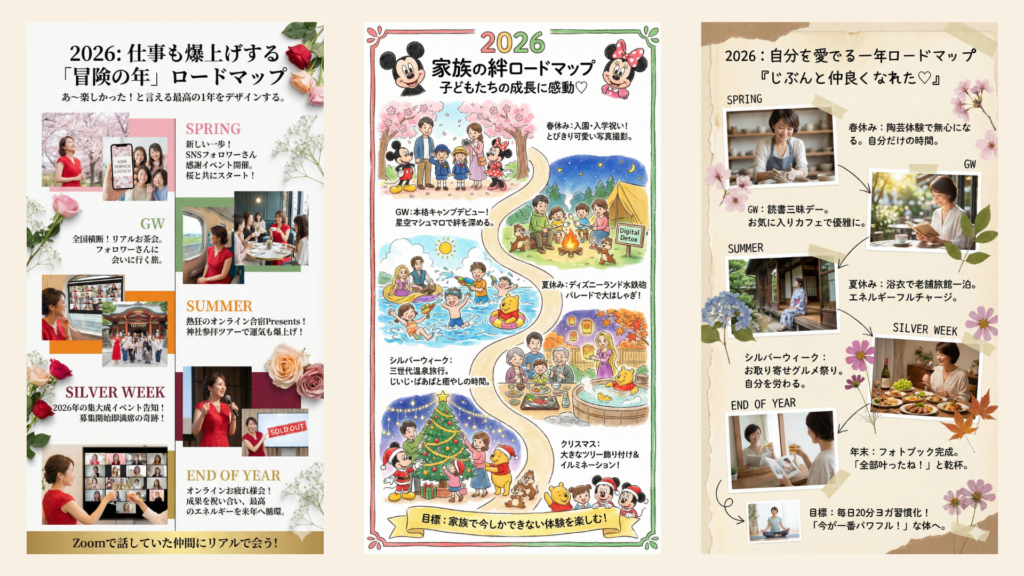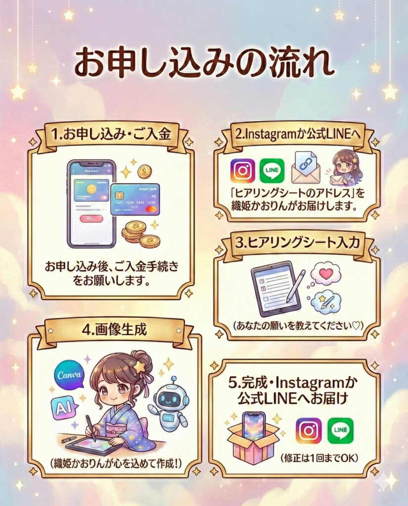 - 画像生成: ヒアリング内容を元に、AIとCanvaを駆使して世界に一つの画像を作成します。