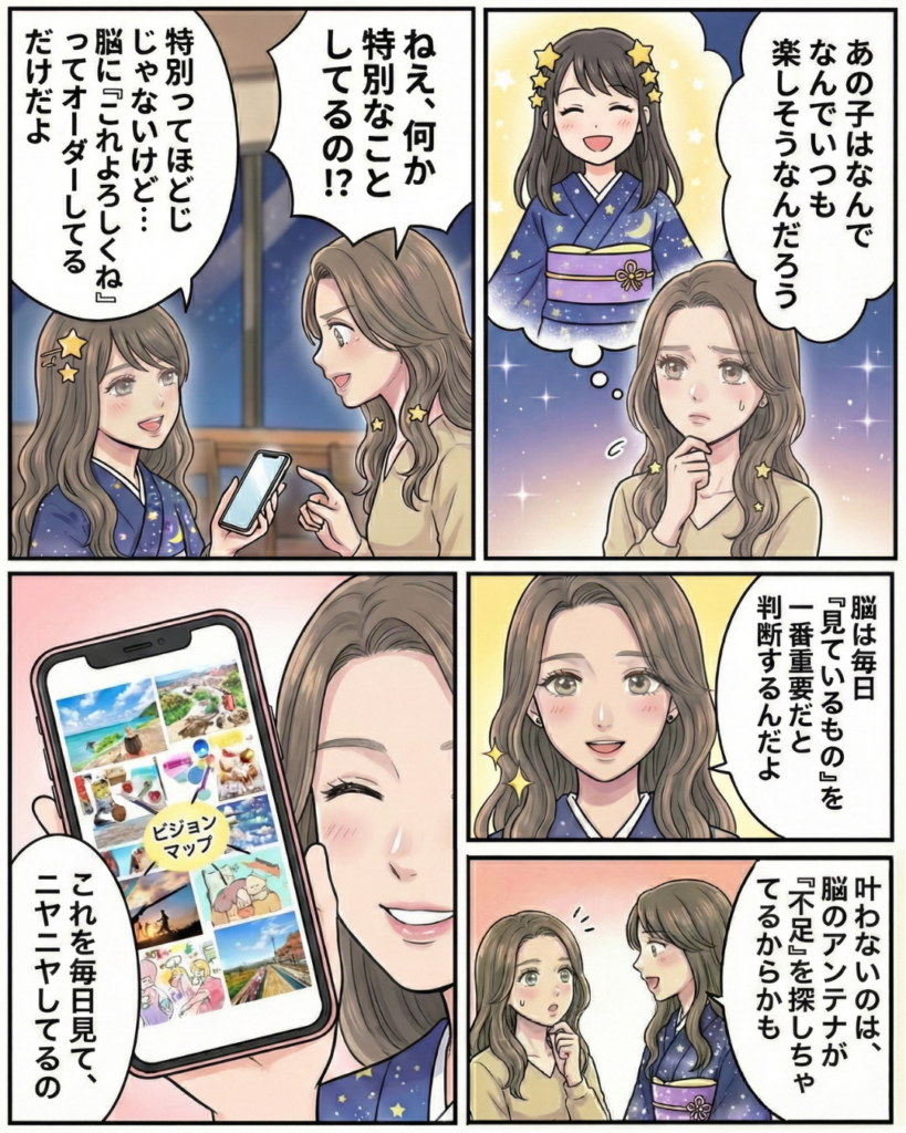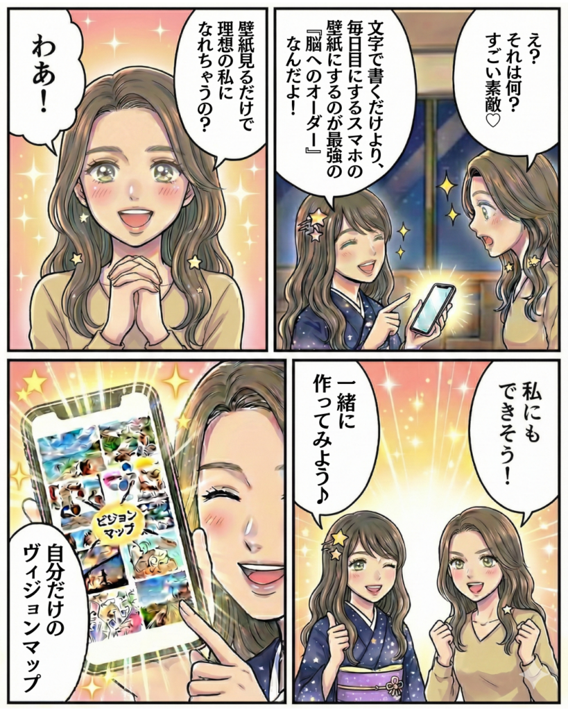 スマホを見る回数は、1日平均100回以上とも言われます。そのたびに、無意識のうちに理想の未来を目にするのです。頑張ってイメージしようとしなくても大丈夫。見るだけで心がときめき、自然と潜在意識が書き換わっていきます。