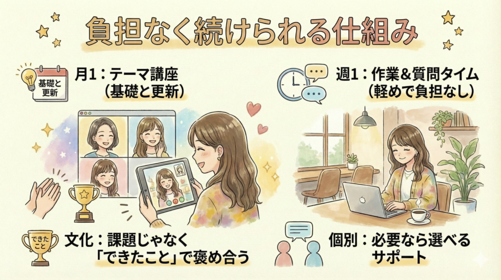 - 週1:作業&質問タイム(小さな疑問を即解決)